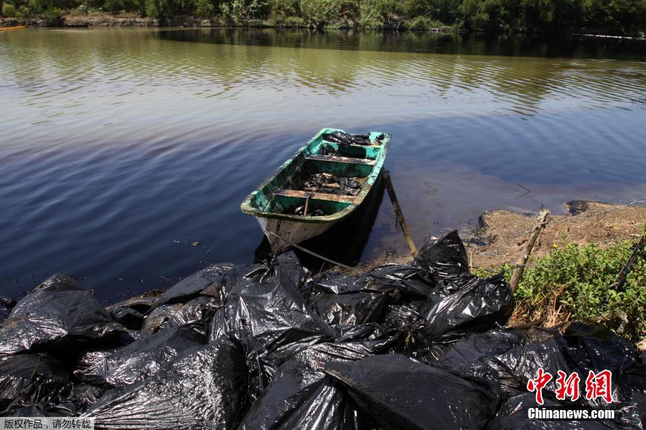 当地时间2014年8月22日,墨西哥蒙特雷,墨西哥国有石油公司发生漏油事件,污染了圣胡安河水源,石油公司工人进行清理工作。