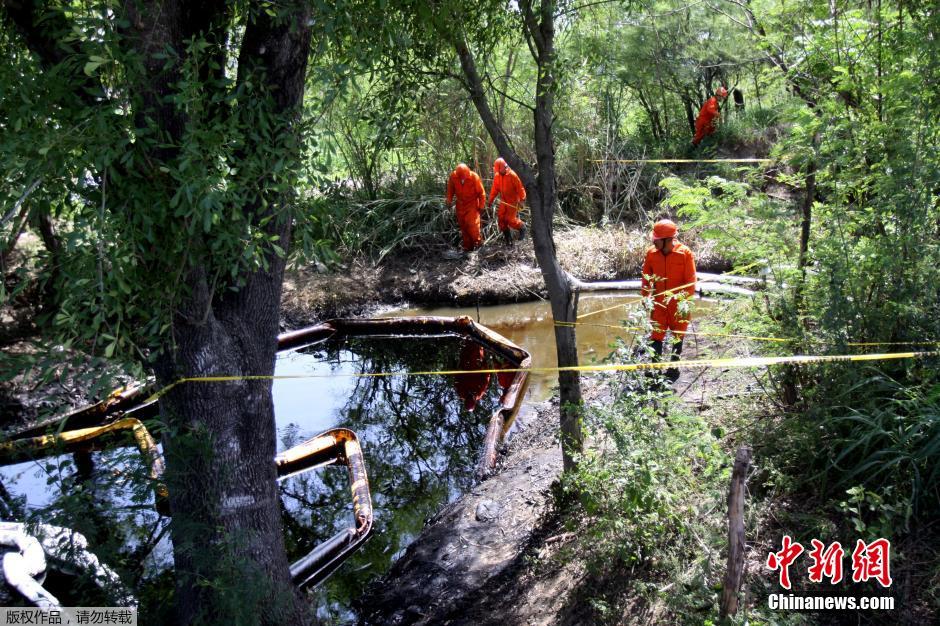 当地时间2014年8月22日,墨西哥蒙特雷,墨西哥国有石油公司发生漏油事件,污染了圣胡安河水源,石油公司工人进行清理工作。