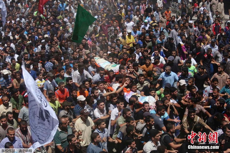当地时间2014年8月21日,加沙拉法,几万名巴勒斯坦民众以及巴勒斯坦各派别在加沙地带南部拉法省为11名死者送葬,其中包括3名被以军炸死的哈马斯武装派别卡桑旅的领导人拉伊德·阿塔尔、穆罕默德·沙马拉和穆罕默德·巴尔胡姆。