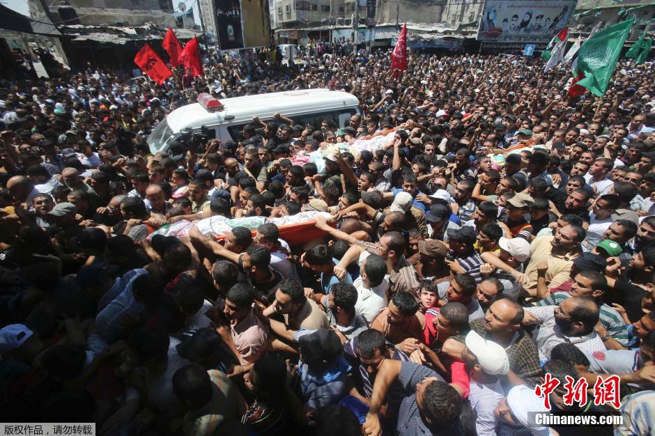 当地时间2014年8月21日,加沙拉法,几万名巴勒斯坦民众以及巴勒斯坦各派别在加沙地带南部拉法省为11名死者送葬,其中包括3名被以军炸死的哈马斯武装派别卡桑旅的领导人拉伊德·阿塔尔、穆罕默德·沙马拉和穆罕默德·巴尔胡姆。