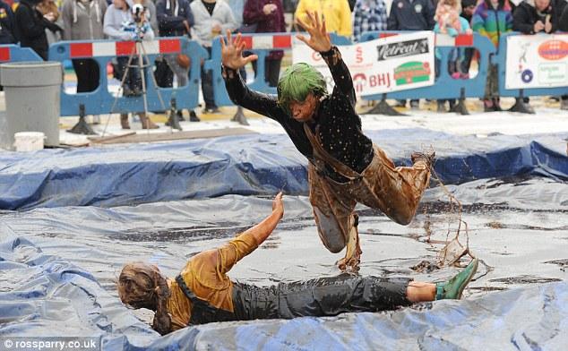 据英国《每日邮报》8月26日报道,一场非常有趣的2014年世界肉汁摔跤大赛在英国举行,选手们穿上奇装异服在1500升的肉汁里娱乐的同时还体验一下美味。(网页截图)