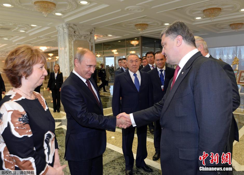 据外电报道,在白俄罗斯首都明斯克26日即将召开国际会议前夕,与会的俄罗斯总统普京与乌克兰总统波罗申科握手致意。