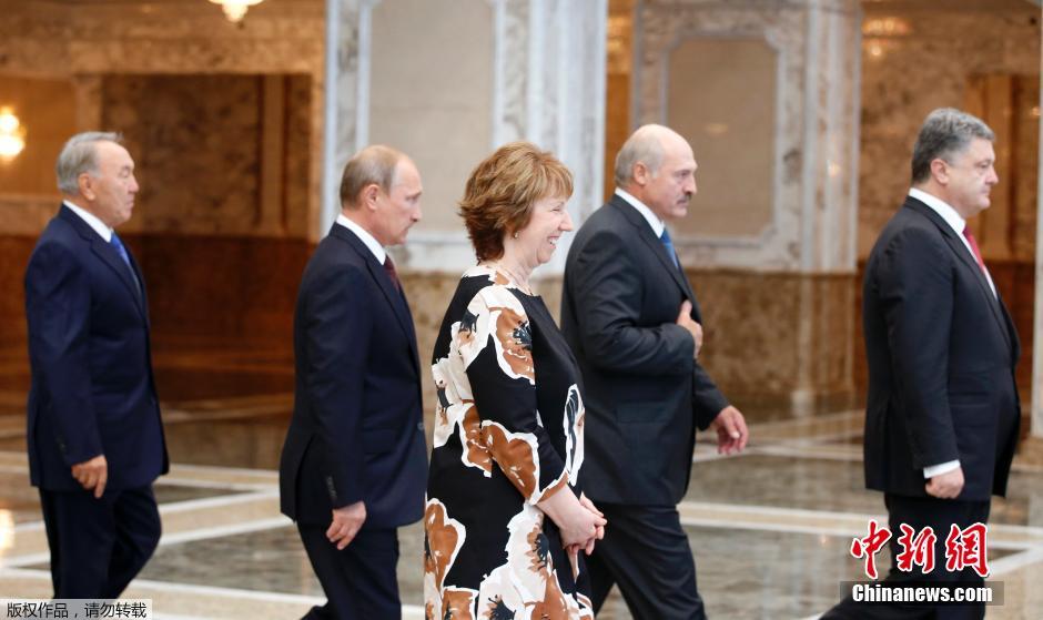 据外电报道,在白俄罗斯首都明斯克26日即将召开国际会议前夕,与会的俄罗斯总统普京与乌克兰总统波罗申科握手致意。