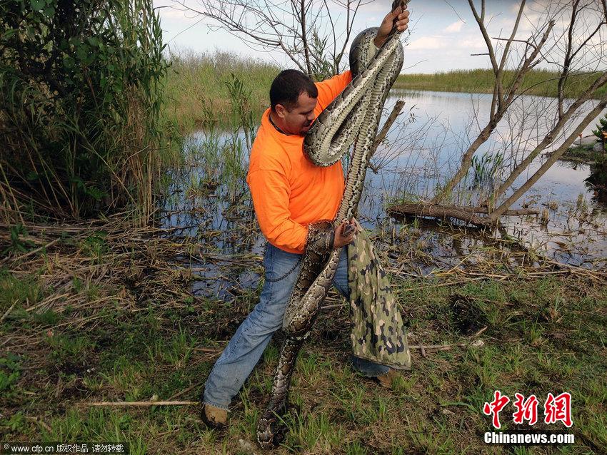 近日,美国佛罗里达,41岁的鲁本·拉米雷斯(Ruben Ramirez)是一名商人,也是一名自然资源保护论者。他在业余时间前往弗罗里达大沼泽地从事捕捉蟒蛇的工作。这些蟒蛇被认定为入侵物种。鲁本·拉米雷斯捕获蟒蛇后交给研究机构,也留下一些用于自家家中建立的教育机构。这些照片展现了鲁本·拉米雷斯捕捉蟒蛇的高超技艺。2013年,捕获18条蟒蛇的鲁本·拉米雷斯(Ruben Ramirez)成为美国佛州捕捉蟒蛇大赛专业组的赢家。 图片来源:CFP视觉中国