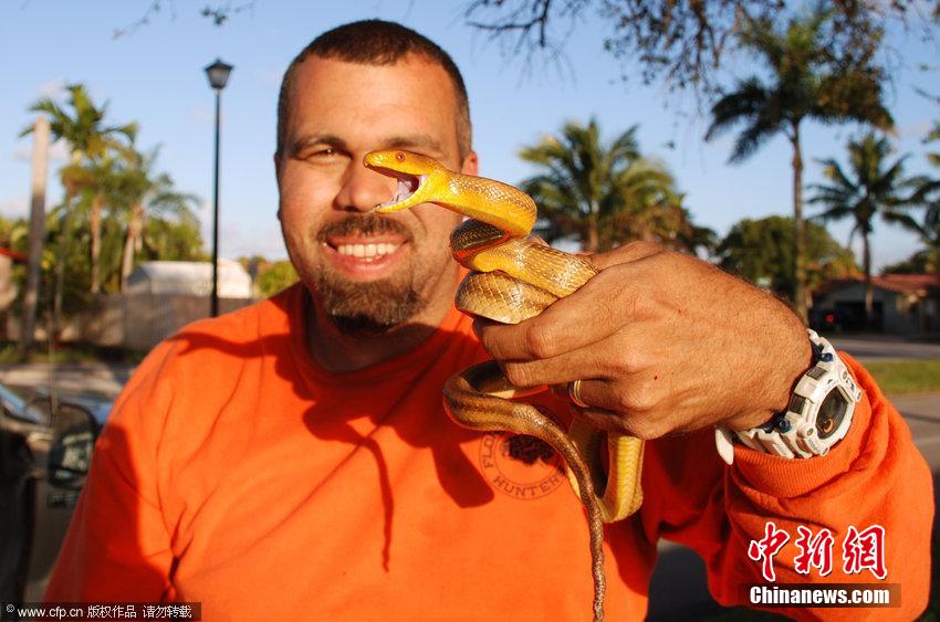近日,美国佛罗里达,41岁的鲁本·拉米雷斯(Ruben Ramirez)是一名商人,也是一名自然资源保护论者。他在业余时间前往弗罗里达大沼泽地从事捕捉蟒蛇的工作。这些蟒蛇被认定为入侵物种。鲁本·拉米雷斯捕获蟒蛇后交给研究机构,也留下一些用于自家家中建立的教育机构。这些照片展现了鲁本·拉米雷斯捕捉蟒蛇的高超技艺。2013年,捕获18条蟒蛇的鲁本·拉米雷斯(Ruben Ramirez)成为美国佛州捕捉蟒蛇大赛专业组的赢家。 图片来源:CFP视觉中国
