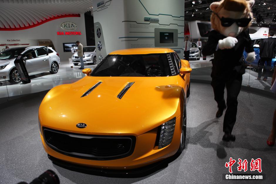 8月27日,2014年莫斯科国际车展“媒体日”开展,据展方公布信息,全球约50个汽车品牌参展亮相,预计参观者将达100万人。图为一名卡通扮相的男车模,正在配合摄影记者拍摄动感图片。贾靖峰 摄