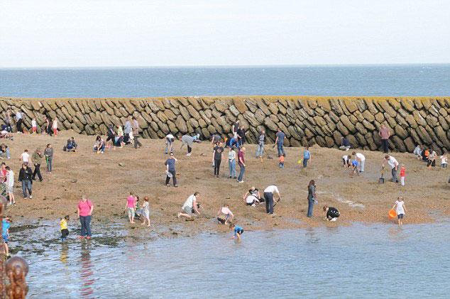 据英国《每日邮报》8月28日报道,在英国的肯特郡,作为当地城镇艺术节的一部分,德国艺术家迈克尔?赛尔斯托夫(Michael Sailstorfer)在福克斯顿港的外港口海滩埋藏了30件24K总价值为1万英镑(约合人民币10万元)的金条供人们挖掘寻找。藏在沙滩下面的金条尺寸大小不一,谁能幸运地找到就归谁所有。可想而知,这个海滨度假村将会很快迎来蜂拥而至的“淘金者”。(网页截图)