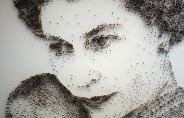 据英国《每日邮报》8月26报道,英国沃灵顿市的一名52岁的艺术家用锤子和钉子制作出了一幅幅美丽的名人肖像,其中包括玛丽莲·梦露、“披头士”,甚至是英国女王。这位艺术家名叫大卫·福斯特(David Foster),目前已经用完了近3万颗钉子。