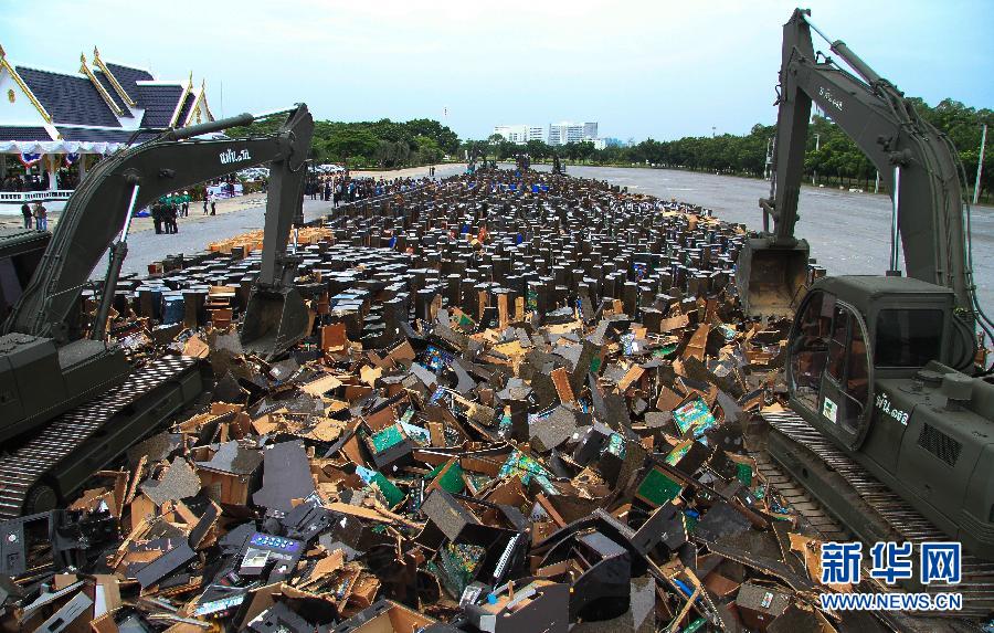 8月30日,在泰国曼谷,泰国军警使用重型工程机械销毁赌博机。当日,泰国军警在曼谷销毁了3777台赌博机。泰国“全国维持和平秩序委员会”在全国发起了处理赌博问题的运动。 新华社 拉亨摄