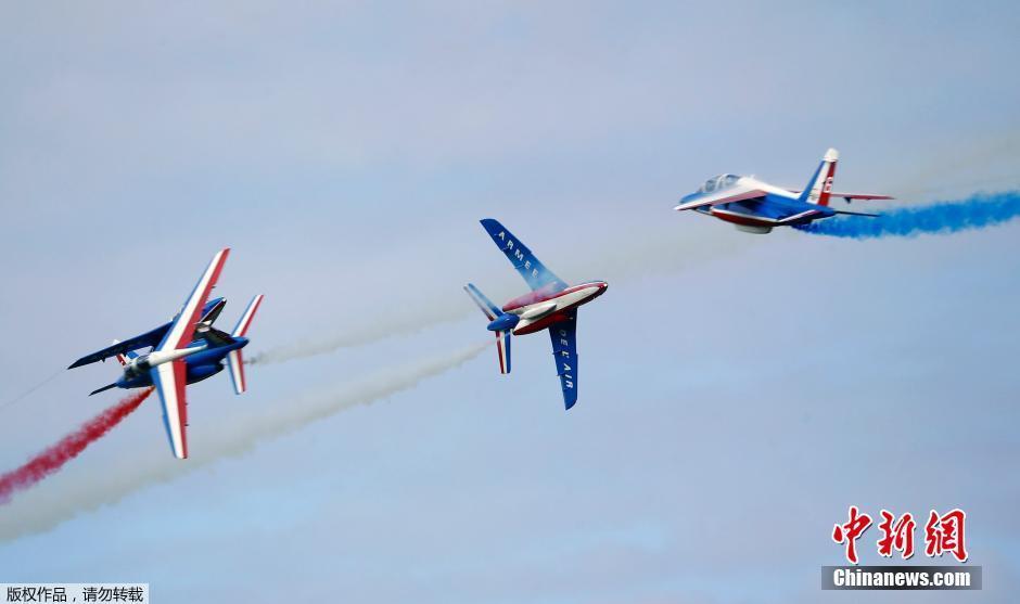 当地时间8月30日,瑞士Air14航展迎来百年历史。各国空军飞行员在帕耶讷(Payerne)机场上空展示飞行技艺。图为法国巡逻兵特技飞行表演队在表演。