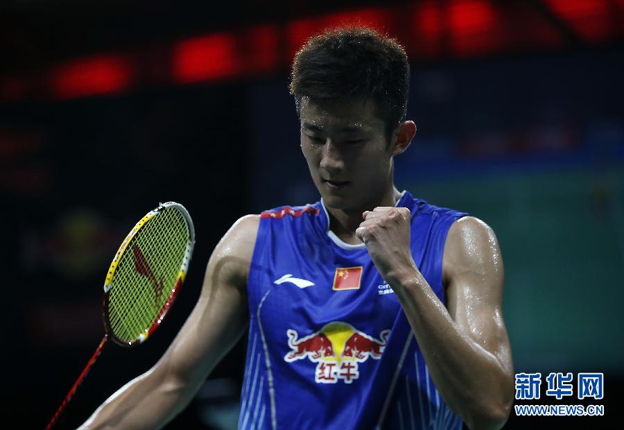8月31日,中国选手谌龙在决赛中。当日,在丹麦哥本哈根巴勒鲁普超级体育馆举行的2014年世界羽毛球锦标赛男子单打决赛中,中国选手谌龙以2比0战胜马来西亚选手李宗伟,夺得冠军。新华社记者王丽莉摄