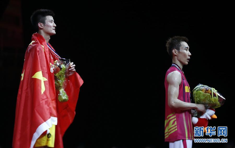 8月31日,中国选手谌龙(左)与马来西亚选手李宗伟在颁奖仪式上。当日,在丹麦哥本哈根巴勒鲁普超级体育馆举行的2014年世界羽毛球锦标赛男子单打决赛中,中国选手谌龙以2比0战胜马来西亚选手李宗伟,夺得冠军。新华社记者王丽莉摄