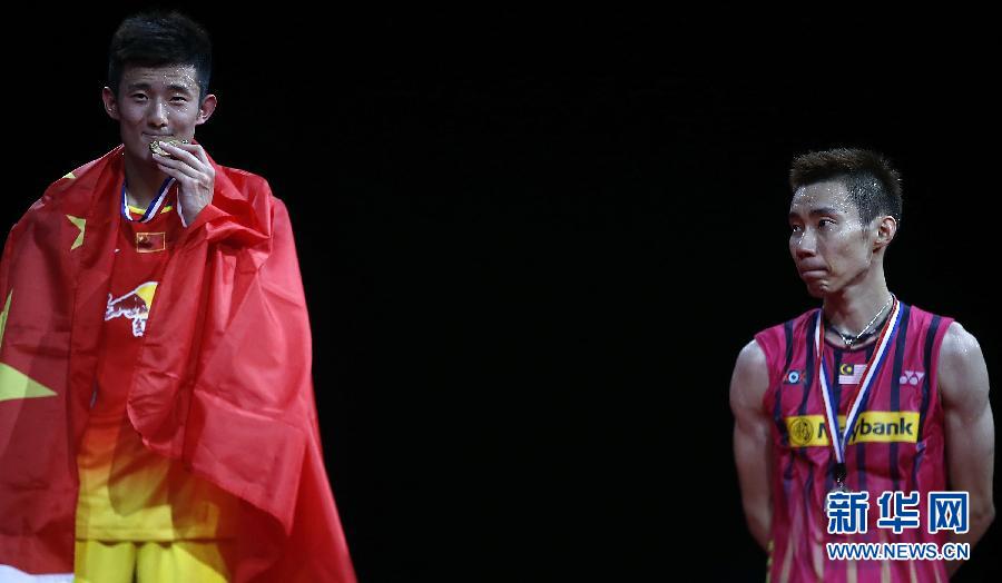 8月31日,马来西亚选手李宗伟(右)在颁奖仪式上望向亲吻金牌的中国选手谌龙。当日,在丹麦哥本哈根巴勒鲁普超级体育馆举行的2014年世界羽毛球锦标赛男子单打决赛中,马来西亚选手李宗伟以0比2不敌中国选手谌龙,获得亚军。新华社记者王丽莉摄