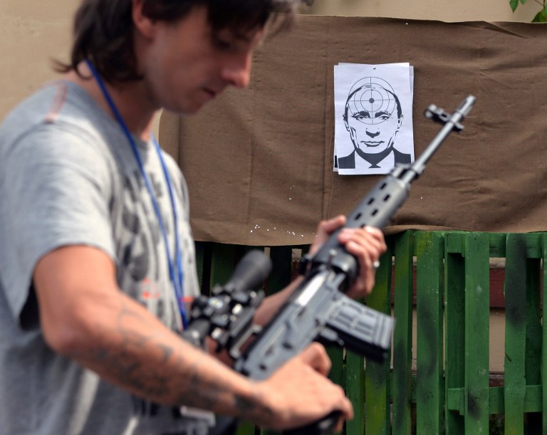 当地时间8月31日,乌克兰西部重镇利沃夫市中心的一个靶场,当地人用普京肖像做靶纸进行射击练习。