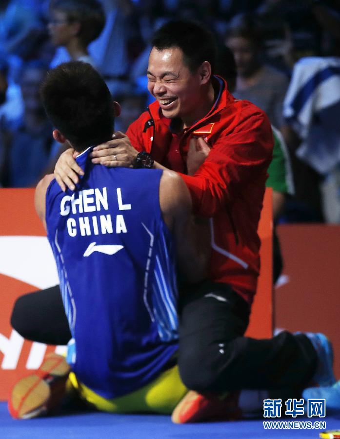 8月31日,中国选手谌龙在决赛后与教练夏煊泽(右)庆祝夺冠。当日,在丹麦哥本哈根巴勒鲁普超级体育馆举行的2014年世界羽毛球锦标赛男子单打决赛中,中国选手谌龙以2比0战胜马来西亚选手李宗伟,夺得冠军。新华社记者王丽莉摄