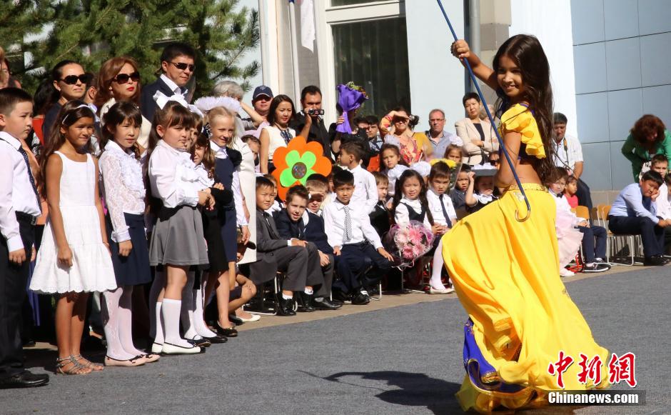 9月1日,在哈萨克斯坦首都阿斯塔纳的一所全日制中学内,校方安排了文艺节目,庆祝新学期开始。当天哈萨克斯坦全国中、小学开学,学生们结束暑假,迎来新学期。 中新社发 王修君 摄