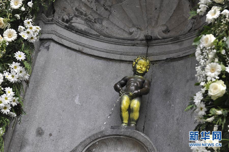 在比利时首都布鲁塞尔,当地著名旅游景点“撒尿小童”于连的雕像被人喷上黄漆(9月1日摄)。布鲁塞尔市政厅谴责这种恶作剧是“可耻的”行为,当地警方已介入调查,通过调取雕像附近的摄像头寻找嫌疑人,工作人员也将于第二天清理于连雕像。新华社记者叶平凡摄