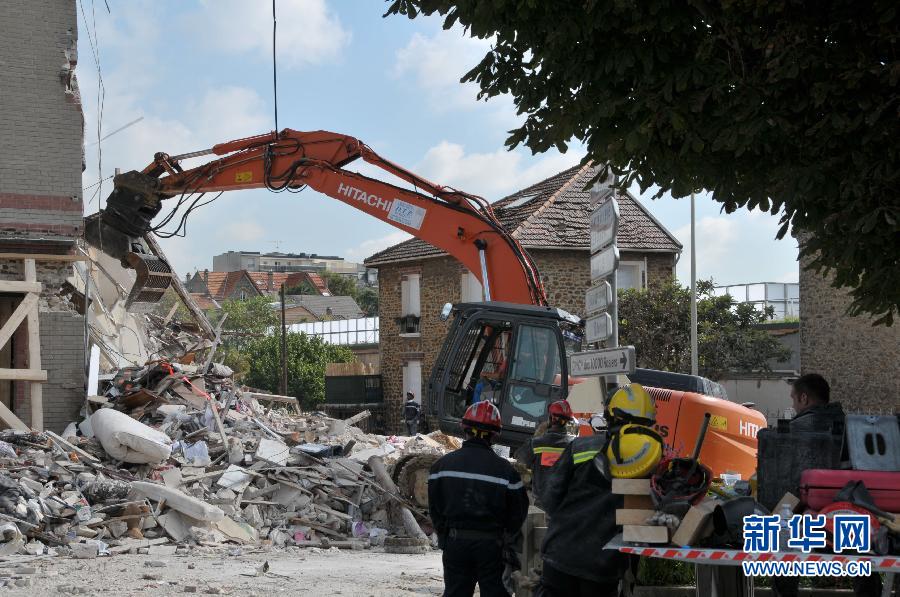 9月1日,在法国塞纳-圣但尼省罗尼苏布瓦镇,救援人员使用大型机械在居民楼倒塌事故现场展开救援。新华社记者周飒昂摄