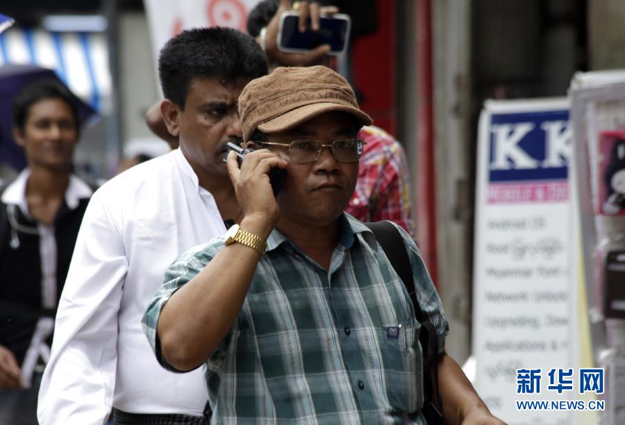 9月1日,在缅甸仰光,一名男子使用手机。新华社发(吴昂摄)