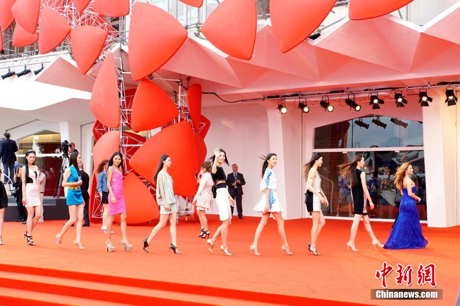 意大利时间2014年9月2日下午,广西卫视《超模之路罗仑模特争霸赛》真人秀在意大利威尼斯拍外景。恰逢威尼斯电影节,在意大利演员兼主持人Antonella Salvacci的带领下,中国模特走上了威尼斯电影节的红毯。从模特码头登岸到走完红毯,现场引发小小骚动。中新社发 骆文刚 摄 图片来源:CNSPHOTO