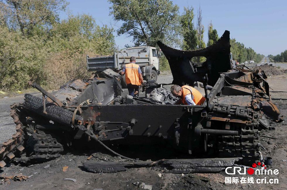 当地时间2014年9月2日,乌克兰顿涅茨克地区检查站遭毁,政府军坦克面目全非。图片来源:CFP