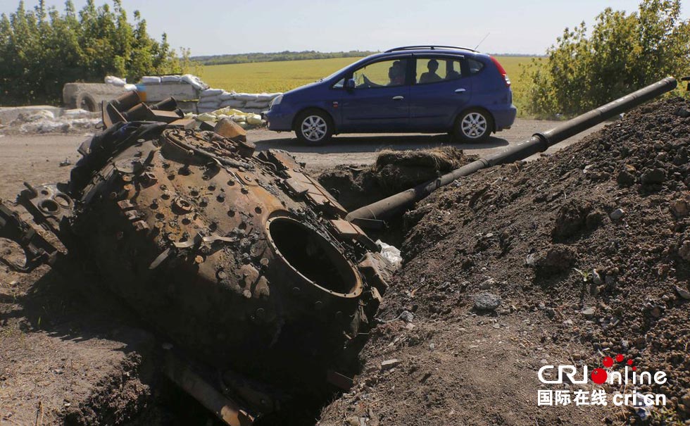 当地时间2014年9月2日,乌克兰顿涅茨克地区检查站遭毁,政府军坦克面目全非。图片来源:CFP