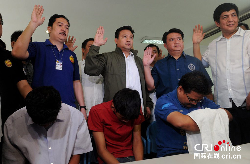 当地时间2014年9月2日,菲律宾马尼拉,被扣押在司法部的3名嫌犯。菲律宾国家调查局官员透露,当日成功制止的马尼拉国际机场汽车炸弹案,是由不满菲律宾政府南海策略的激进人士所为,中国大使馆也是攻击目标之一。图片来源:JAY DIRECTO/CFP