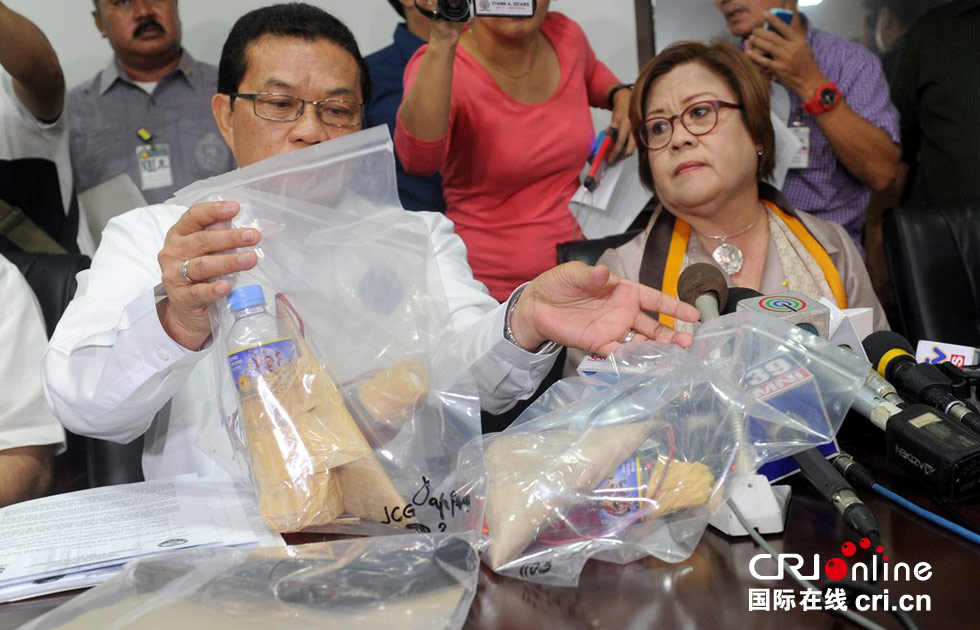当地时间2014年9月2日,菲律宾马尼拉,司法部长Leila de Lima(右)和国家调查局主任Virgilio Mendez(左)展示查获的火焰炸弹和枪械。菲律宾国家调查局官员透露,当日成功制止的马尼拉国际机场汽车炸弹案,是由不满菲律宾政府南海策略的激进人士所为,中国大使馆也是攻击目标之一。图片来源:JAY DIRECTO/CFP