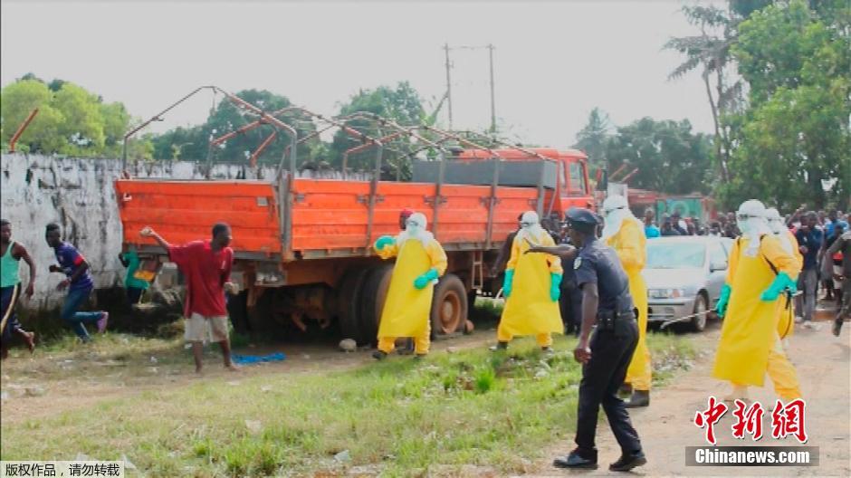当地时间2014年9月2日,利比里亚一名埃博拉病人逃离蒙罗维亚Elwa医院,病人穿过当地市场寻找食物时,被医生发现并进行围堵。