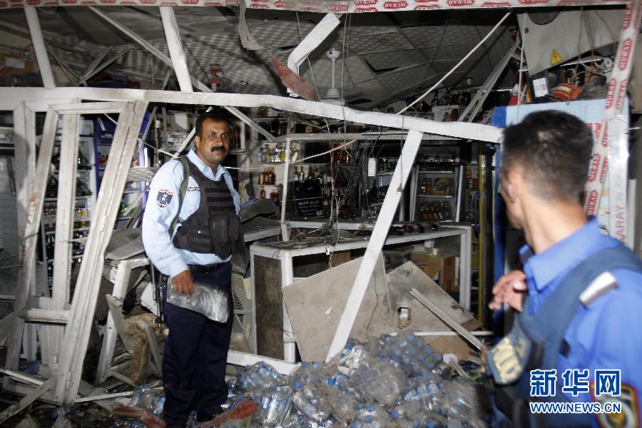 9月4日晚,在伊拉克基尔库克市北部一商店门前,警察在查看爆炸袭击现场。伊拉克警方4日说,伊拉克首都巴格达和北部城市基尔库克当晚发生3起爆炸袭击,共造成至少15人死亡、69人受伤。新华社发(迪娜·阿萨德摄)