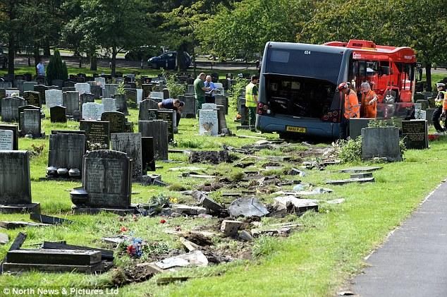 据英国《每日邮报》当地时间2014年9月4日报道,英国盖茨黑德,一辆巴士冲入当地墓地,撞毁约五十块墓碑,造成15人受伤。(网页截图)