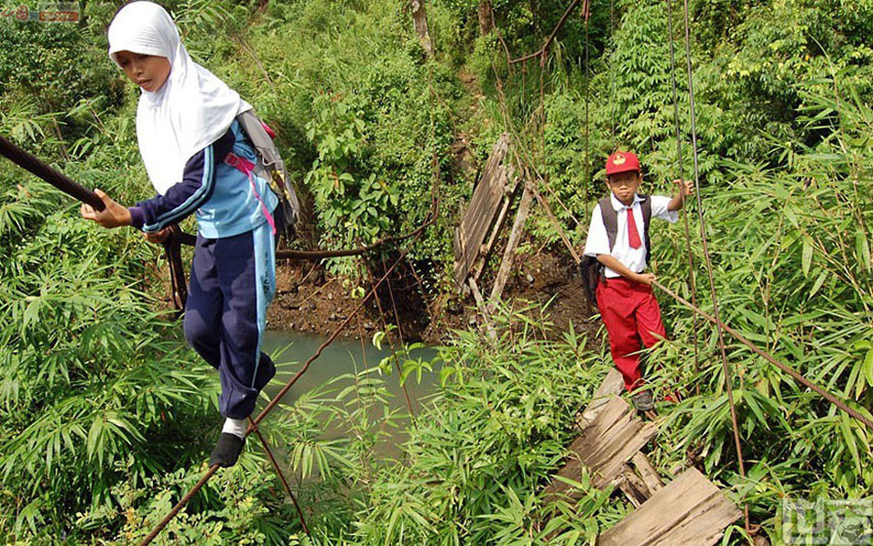 印度尼西亚苏门答腊岛,自从暴雨导致吊桥崩塌以后,Batu Busuk村的20名学生每日需要像马戏团中走钢丝一样地穿过河流上学。