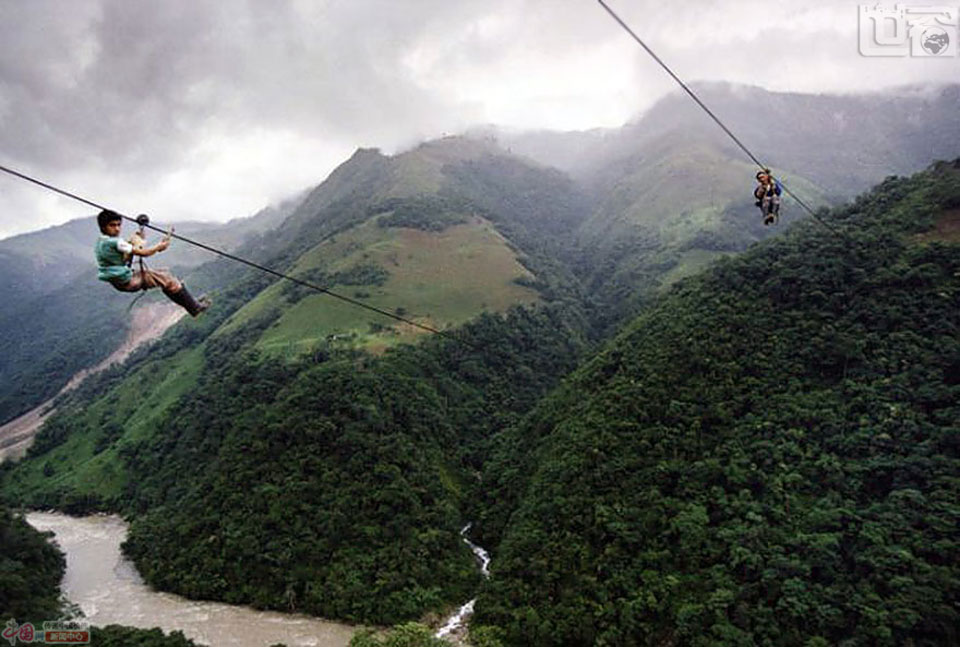 哥伦比亚,孩子们从里奥内格罗河上方400米高空的一根800米的电缆上滑行前往学校。