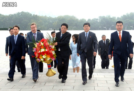 驻朝经贸参赞团瞻仰了矗立在万寿台岗上的金日成和金正日铜像后,向铜像敬献了花篮,表示敬意。