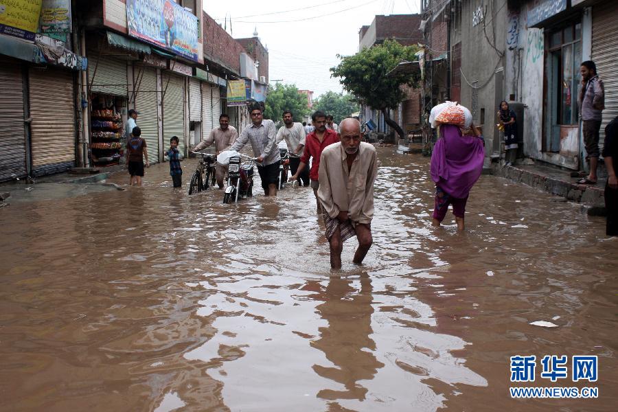 9月4日,在巴基斯坦旁遮普省首府拉合尔,人们在暴雨后被洪水淹没的街道上涉水前行。据巴基斯坦媒体5日报道,巴东部旁遮普省等地区过去两天的暴雨已造成至少72人死亡、100多人受伤。 新华社发(贾米勒·艾哈迈德摄)
