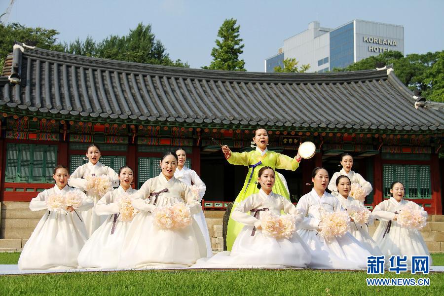 9月8日,演员在韩国首尔的德寿宫即祚堂庭院前表演韩国传统民谣。当日,为迎接中秋节,韩国的景福宫、昌德宫、昌庆宫、德寿宫、朝鲜王陵、宗庙向公众免费开放,在古建筑中举行韩国传统国乐公演、宗庙祭礼乐与庙见礼、投壶等传统民俗游艺活动,吸引众多韩国民众与海外游客参与。新华社记者彭茜摄