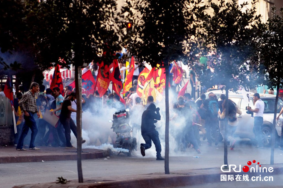 当地时间2014年9月7日,土耳其伊斯坦布尔示威者抗议电梯坠落事件,与防暴警察冲突。6日尔希什利区一处建筑工地的电梯从32层楼高处坠地,致10名工人死亡。图片来源:OZAN KOSE/CFP
