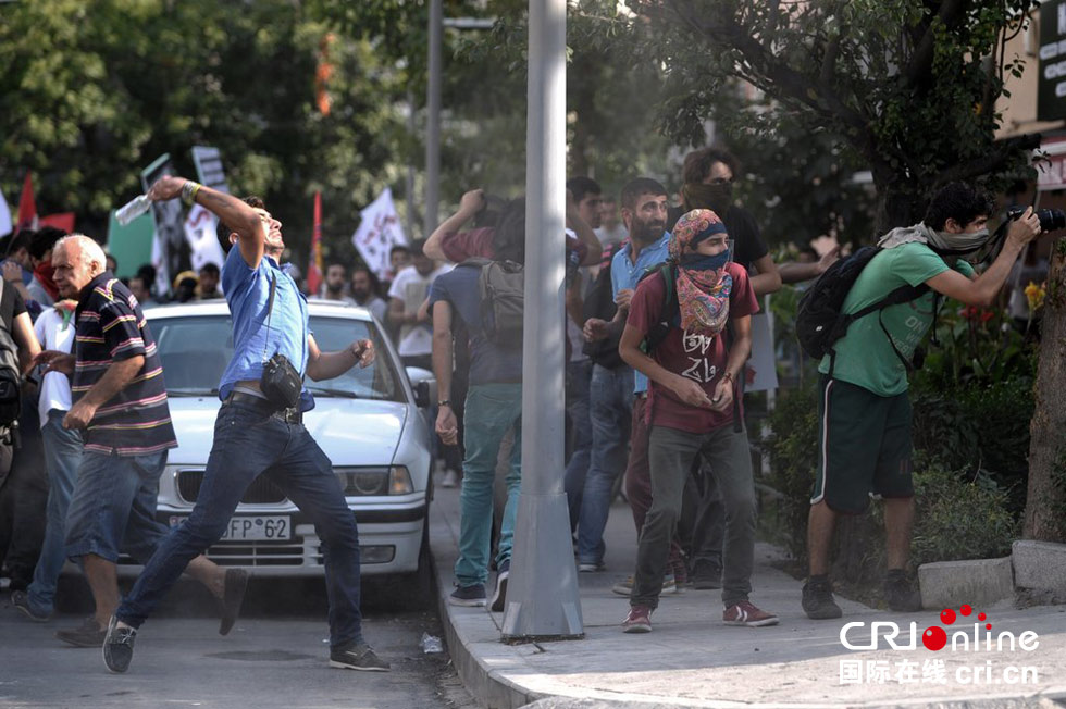 当地时间2014年9月7日,土耳其伊斯坦布尔示威者抗议电梯坠落事件,与防暴警察冲突。6日尔希什利区一处建筑工地的电梯从32层楼高处坠地,致10名工人死亡。 图片来源:OZAN KOSE/CFP