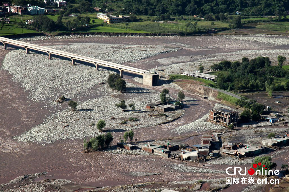 当地时间2014年9月8日,印度查谟和克什米尔地区,当地遭洪水袭击,大桥被冲垮。印度局部地区遭洪水袭击,已致175人死亡。图片来源:STRDEL/CFP