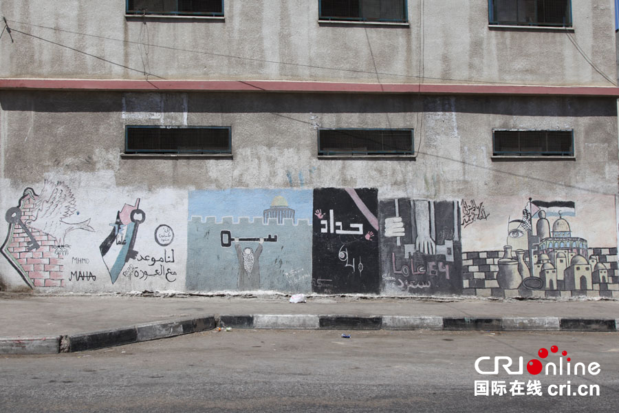 加沙建筑物上呼吁解放巴勒斯坦的涂鸦。(摄影:张瑾)