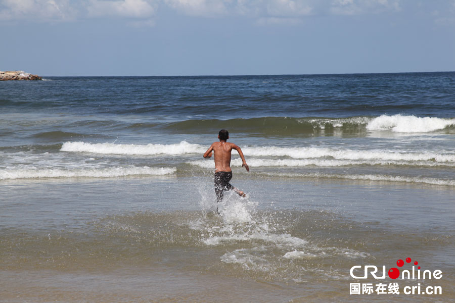 一加沙男孩冲入海中游泳。(摄影:张瑾)
