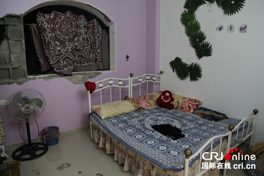 加沙一座民宅中破损的窗户和地板。屋子上层已完全被毁。(摄影:张瑾)