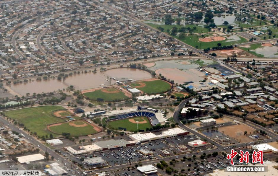当地时间2014年9月8日,美国亚利桑那州,暴雨导致洪水泛滥,当地交通受到严重影响,高速公路和当地街道遭洪水淹没,车辆变“游船”。