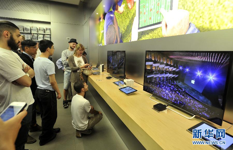 9月9日,在美国纽约曼哈顿,苹果产品粉丝在第五大道苹果旗舰店内观看新产品发布会。当日,美国苹果公司推出两款手机新产品,分别为iPhone 6和iPhone6 Plus,同时推出一款手表。 新华社记者王雷摄