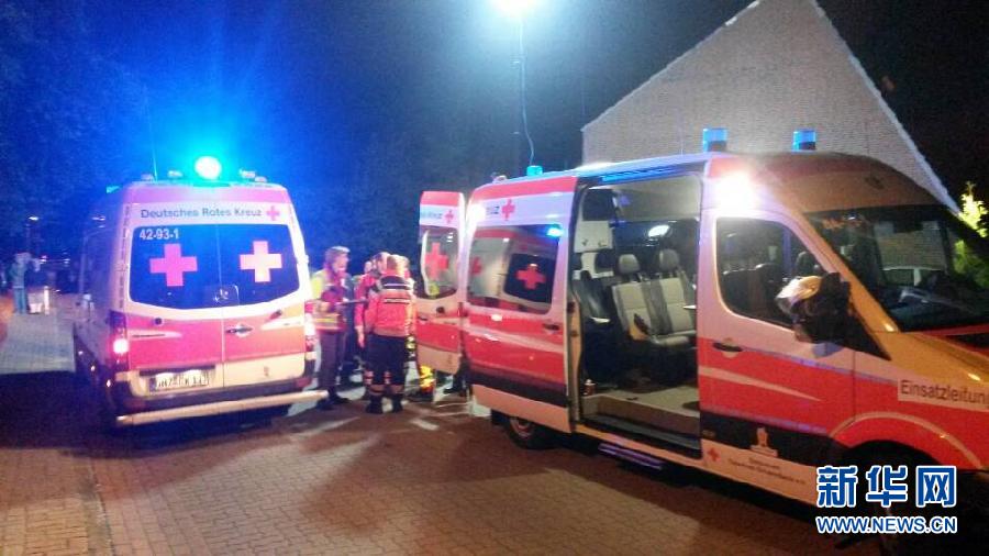 9月9日,在德国北部不来梅市附近,救护车抵达爆炸现场待命(手机拍摄)。 新华社记者胡小兵摄