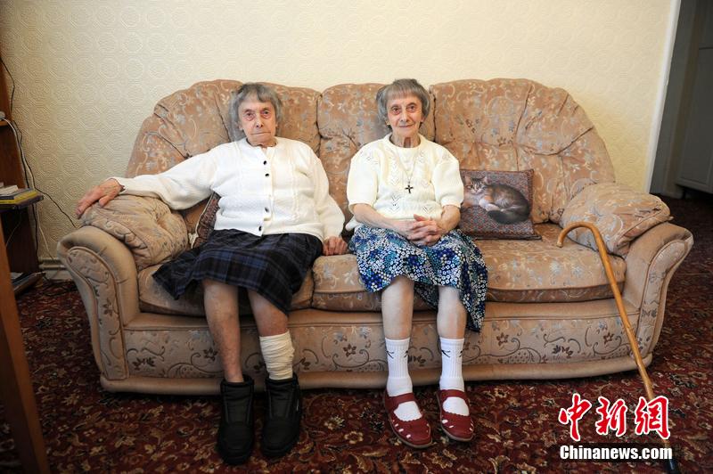 当地时间2014年9月5日报道(具体拍摄时间不详),英国西米德兰兹郡,现年96岁的异卵双胞胎姐妹Joan和Jessie Baker在一起同吃同住90年,且都终身未嫁。她俩每天吃同样的饭菜,用同一个衣柜,甚至每次购物时,都会按照对方的购物清单置办商品。而6年前,这对高龄姐妹决定分开居住,原因是姐妹俩喜欢不同的住房风格,分别搬入了各自的一居室公寓,相距仅5分钟路程。图片来源:东方IC 版权作品 请勿转载