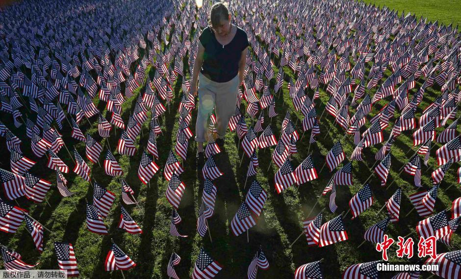 当地时间2014年9月10日,美国伊利诺斯州,民众竖起3000面美国国旗,纪念9·11事件中的约3000名受害者。2001年9月11日上午(北京时间9月11日晚上)恐怖分子劫持的4架民航客机撞击美国纽约世界贸易中心(双子塔)和华盛顿五角大楼。民众纪念9·11恐怖事件发生13周年。