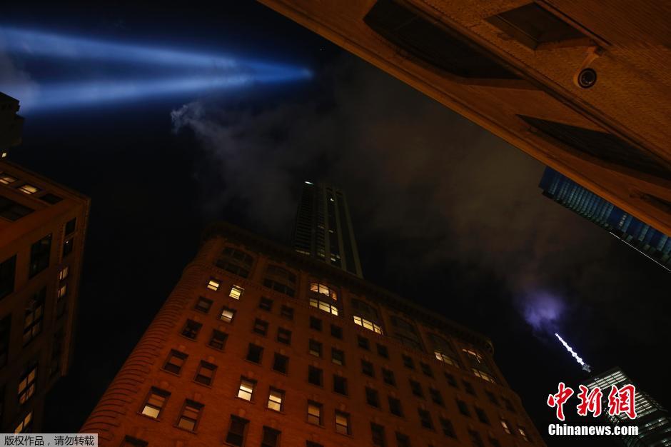当地时间2014年9月10日,美国纽约曼哈顿下城,一条光柱划破夜空直至天际,用这种方式纪念在美国9.11恐怖袭击中不幸遇难的同胞。2001年9月11日上午(北京时间9月11日晚上)恐怖分子劫持的4架民航客机撞击美国纽约世界贸易中心(双子塔)和华盛顿五角大楼,约3000名无辜民众丧生。