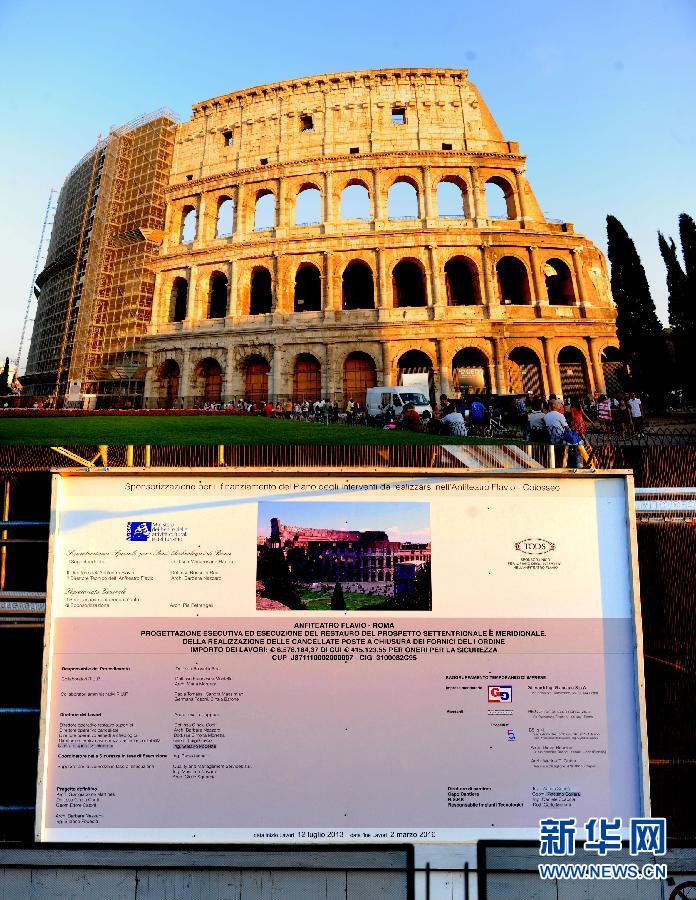 这张拼版照片显示正在维修中的古罗马斗兽场(上图)以及在斗兽场外侧搭建的脚手架上挂有修缮工程赞助商TOD’S集团的标志(9月9日摄)。新华社记者许逆之摄