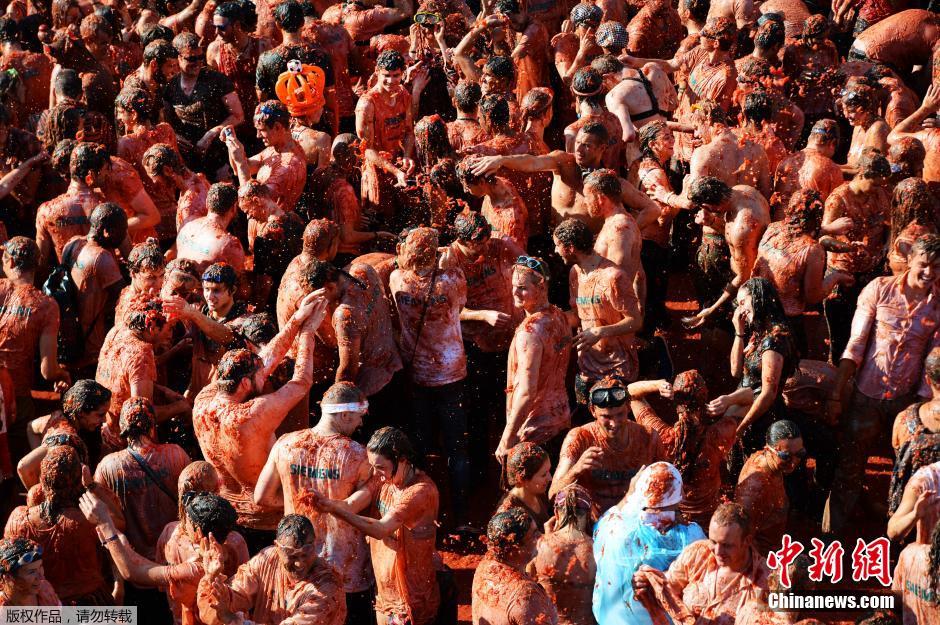 当地时间2014年9月14日,荷兰阿姆斯特丹,民众参加番茄大战,选手互扔西红柿High翻天,现场变成一片红色的海洋。